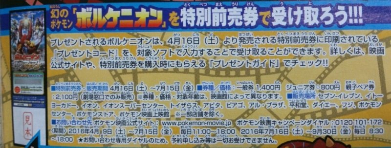 在4月16日~7月15日期间预定最新剧场版(ボルケニオンと机巧のマギアナ)的票可获得No.721(ボルケニオン)的兑换码,70级,配招为蒸汽喷发、燃烧殆尽、水压和白雾,携带道具为愤怒馒头[doge],该兑换码在9月30日前可使用。